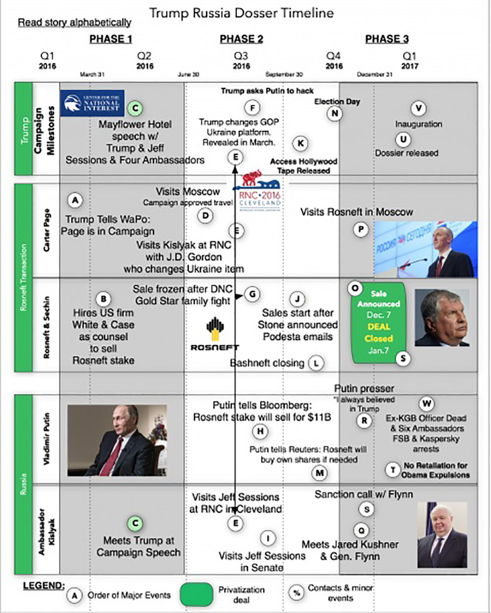 План, раскрытый в досье Стил, вступил в действие в начале мая 2016 года, после того, как кандидат от Республиканской партии Дональд Трамп обошел Теда Круза и был номинирован кандидатом от Республиканской партии на пост президента. Судя по событиям, с июля началась масштабная международная сделка по приватизации нефтекомпании, и она была завершена в начале января – именно в то время, когда Коллегия выборщиков избрала Дональда Трампа 45-м президентом Америки.