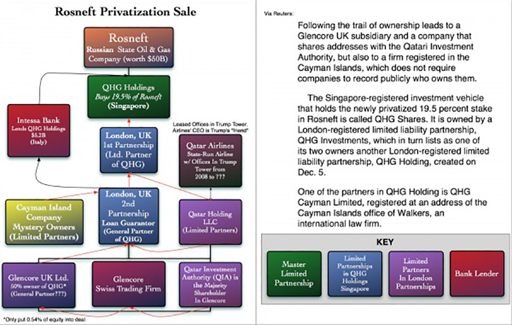 Самым важным товаром в нефтяном бизнесе или политике являются деньги. Приватизационная сделка, раскрытая в досье Кристофера Стила, обсуждается на страницах Bloomberg и Reuters в течение года. Материалы показывают, что в посреднических сделках с нефтью было много денег для партнеров Дональда Трампа, и возможна быстрая прибыль Катара в случае освобождения от санкций в этом году.