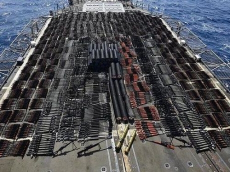 Крейсер USS Monterey Военно-морских сил США задержал в Аравийском море судно, на борту которого находились российские противотанковые ракеты, пулеметы и гранатометы, а также китайские штурмовые винтовки.