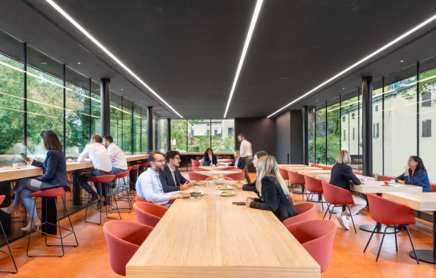 Пол в столовой сделали по специальному заказу из шкурок от томатов – побочных продуктов производственной линии Mutti. По подсчетам, на изготовление полов ушло более 3 тонн отходов. Столовая Quisimangia будет управляться кейтеринговой компанией ViCook.