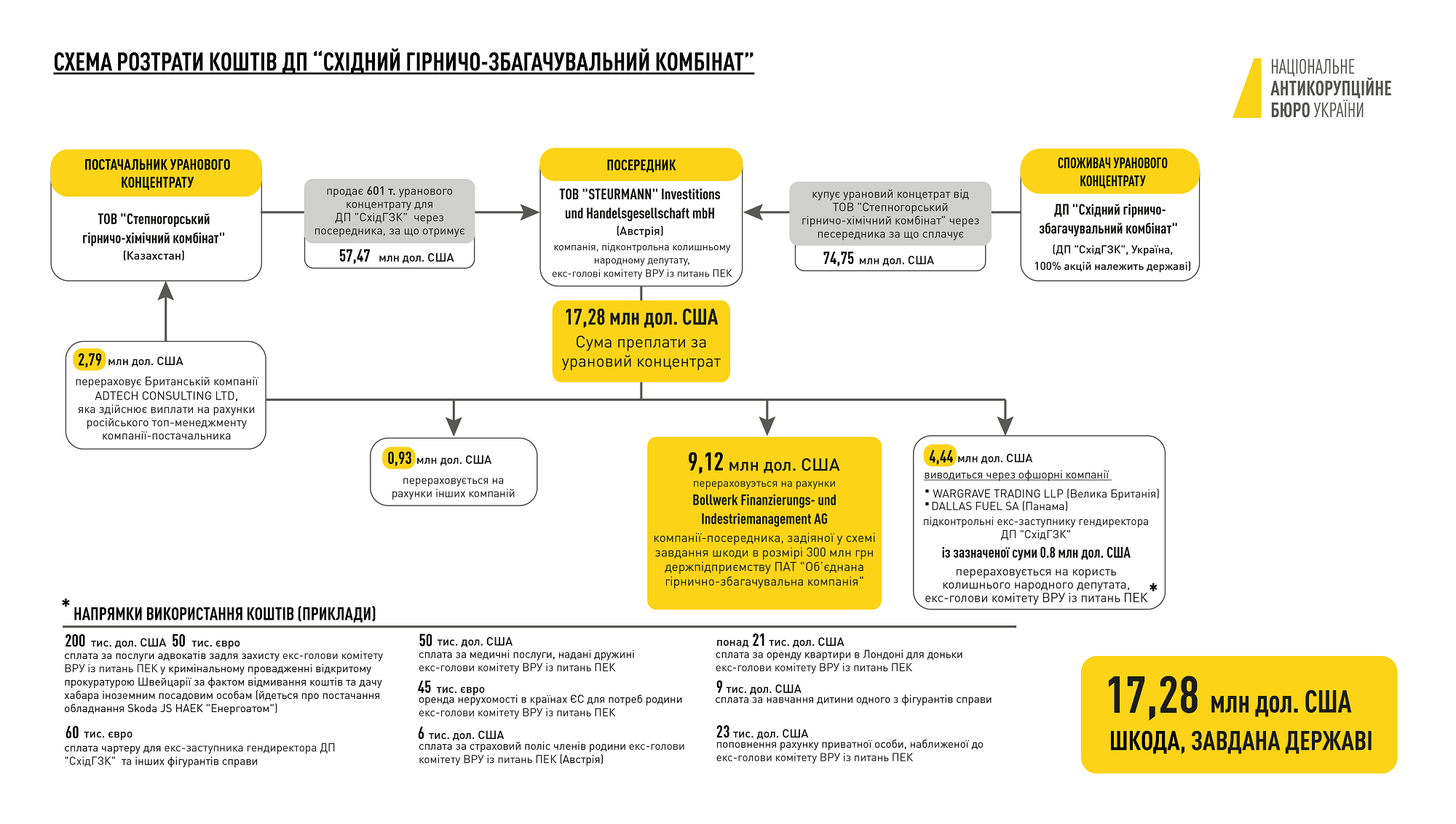 Как установило следствие, среди прочего, средства тратились на аренду недвижимости в странах ЕС для потребностей членов семьи подозреваемых, уплату медицинских услуг, и услуг адвокатов по защите подозреваемого в другом уголовном деле, которое в отношении него открыла прокуратура Швейцарии. Больше деталей можно посмотреть в графической схеме.