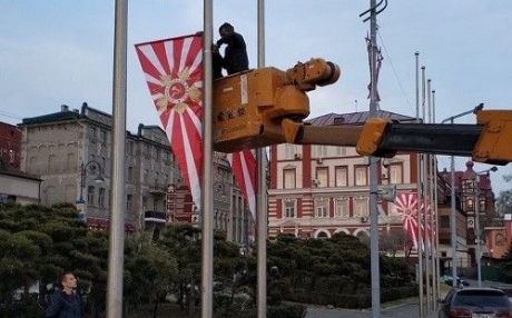На фото видно, как коммунальщики развешивают на столбах полотна с изображением бело-красных лучей, похожих на флаг японских ВМС.