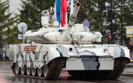 В российском Хабаровске танк в арктическим камуфляже, который двигался в авангарде колонны Т-80, разогнавшись на спуске, не сумел затормозить и врезался в светофор.
