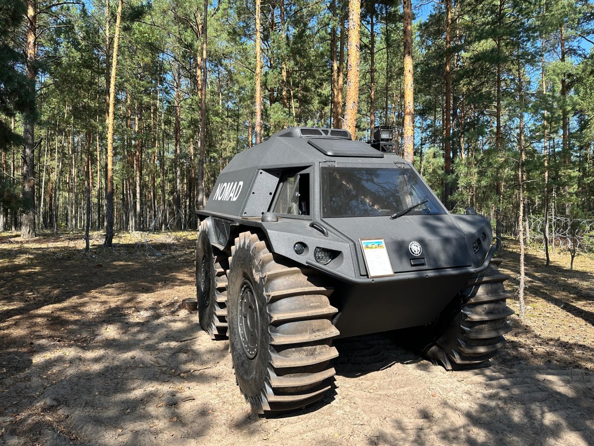 Конструкция NOMAD VSIMN обеспечивает высокую проходимость и способность преодолевать водные преграды, включая болота и любые типы грунтов. Этот транспорт не только движется в условиях, где другие машины останавливаются, но и способен буксировать технику, значительно превышающую его собственный вес. Корпус Nomad изготовлен из современного полимерного материала, выдерживающего большие нагрузки — в несколько тонн — и приспособлен к работе в экстремальных температурах: от -50°C до +90°C. Внутри установлена система климат-контроля, поддерживающая комфортный микроклимат для экипажа, а камера кругового обзора позволяет полностью контролировать обстановку вокруг вездехода даже во время движения в сложных условиях приграничной зоны.