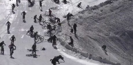 Сотни велосипедистов собираются в Альпах, чтобы преодолеть одну из самых необычных велогонок — «Адскую гору». Спортсмены съезжают из заснеженной горы и пытаются не упасть, но многие сходят с дистанции на первых сотнях метров.