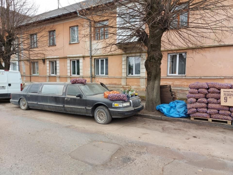 На опубликованных кадрах на капоте лимузина разместили несколько мешков с картошкой и луком, а также ящик с вазонами. Кстати, картофель продают по 9 гривен.