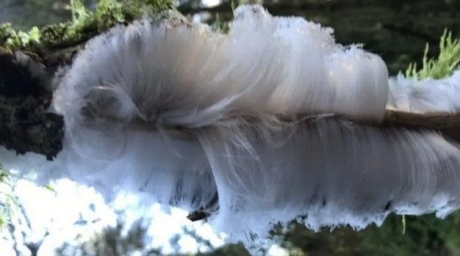 Ученые объяснили, что необычные ледяные кристаллы образуются на трухлявой древесине во влажные зимние ночи, когда температура воздуха составляет чуть ниже нуля. Из-за грибка лед приобретает форму тонких волосков диаметром около 0,01 мм.