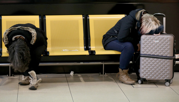 10 February 2020, Cologne: Passengers sleep at Cologne Bonn Airport amid turbulent weather conditions due to storm Sabine. Photo: Oliver Berg/dpa