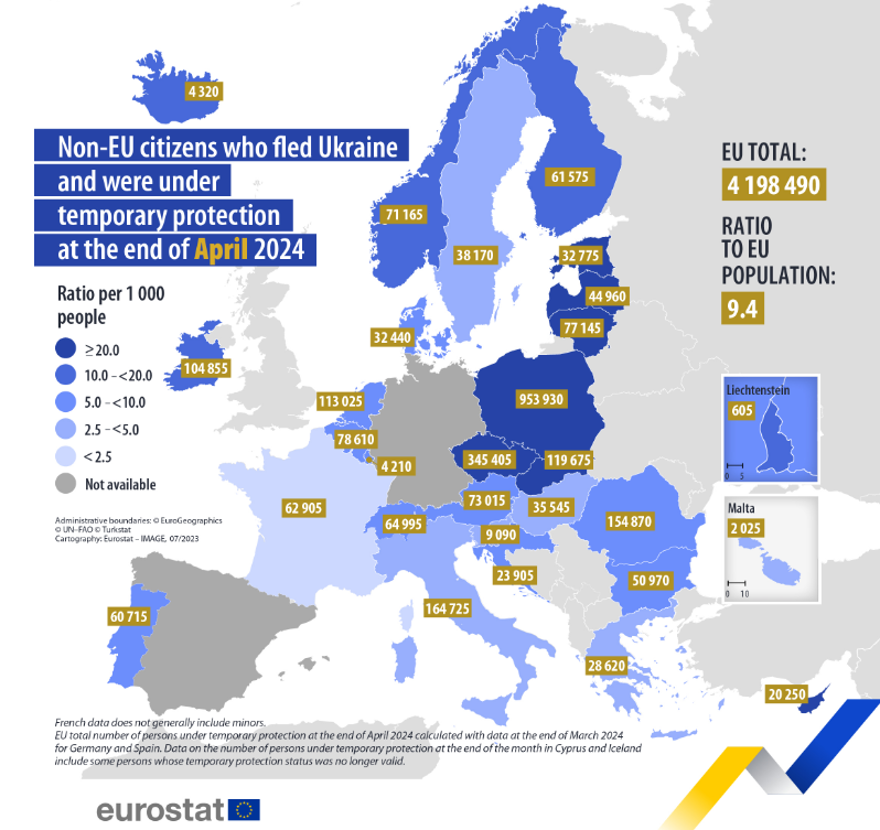 Усього 4,19 млн осіб, які залишили Україну через воєнну агресію Росії, мали статус тимчасового захисту в країнах ЄС на кінець квітня. З них – 98% громадян України.