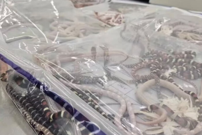 Загалом у кишенях чоловіка знайшли шість пакетів, заклеєних скотчем для захисту. А в пакетах – змії будь-якого виду, розміру та кольору.