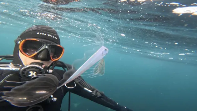 “Вода була настільки чистою, що я вирішив оглянутись під водою, відпливаючи від берега, і я радий, що так зробив. Я побачив щось сріблясте, схоже на лезо ножа, що звивалося на глибині всього близько 4,5 метрів, рухаючись на захід паралельно берегу. Я хотів залишитися поруч, але відчував, що турбую рибу. У неї була дивовижна здатність орієнтуватися так, щоб її вузький профіль завжди був звернений до мене. Я намагався плисти поруч, щоб розглянути її профіль, а вона відверталася від мене. Для мене велика честь побачити це”, – написав дайвер.