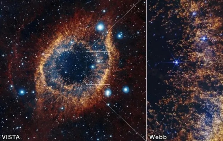 Учені за допомогою телескопа “Джеймс Вебб” отримали знімки знаменитого “Ока Саурона” крупним планом. Це туманність Равлик, яка розташована на відстані 650 світлових років від нас у сузір’ї Водолія, повідомляє Science Alert.
