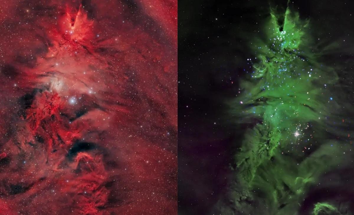 Втім, пил не лише поглинає світло. Поблизу гарячих зірок він розсіює блакитні хвилі, формуючи так звані відбивні туманності. Саме поєднання червоного та блакитного сяйва надає Космічній ялинці багатошарового, майже святкового вигляду.