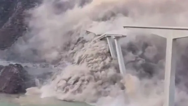 Відеозаписи з місця події зафіксували момент катастрофи, коли схил пагорба починає повільно осідати, після чого під мостом утворюється потужний зсув. Земля, каміння та пил поглинають основу споруди, бетонні колони нахиляються, і за деякий час значна частина мосту провалюється вниз.