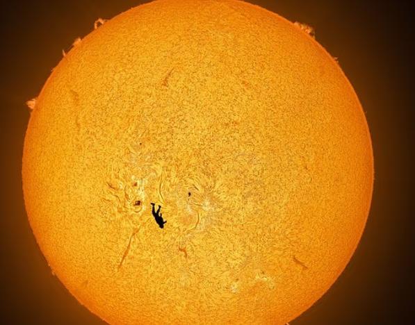На фото видно не лише силует парашутиста, а й деталі Сонця: темні плями та тонкі смуги філаментів, створені магнітним полем зірки. Це стало можливим завдяки зйомці у спеціальному діапазоні видимого світла, де дрібні деталі не зливаються з яскравим Сонцем.
