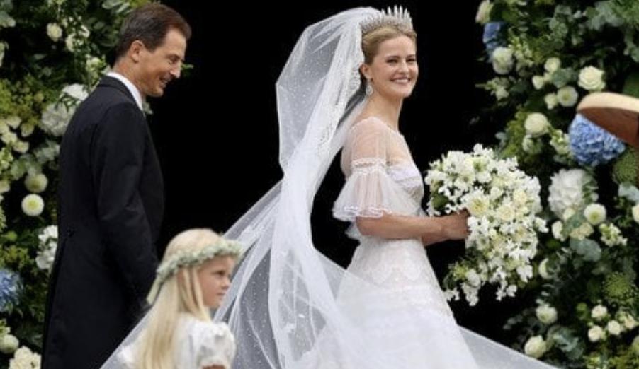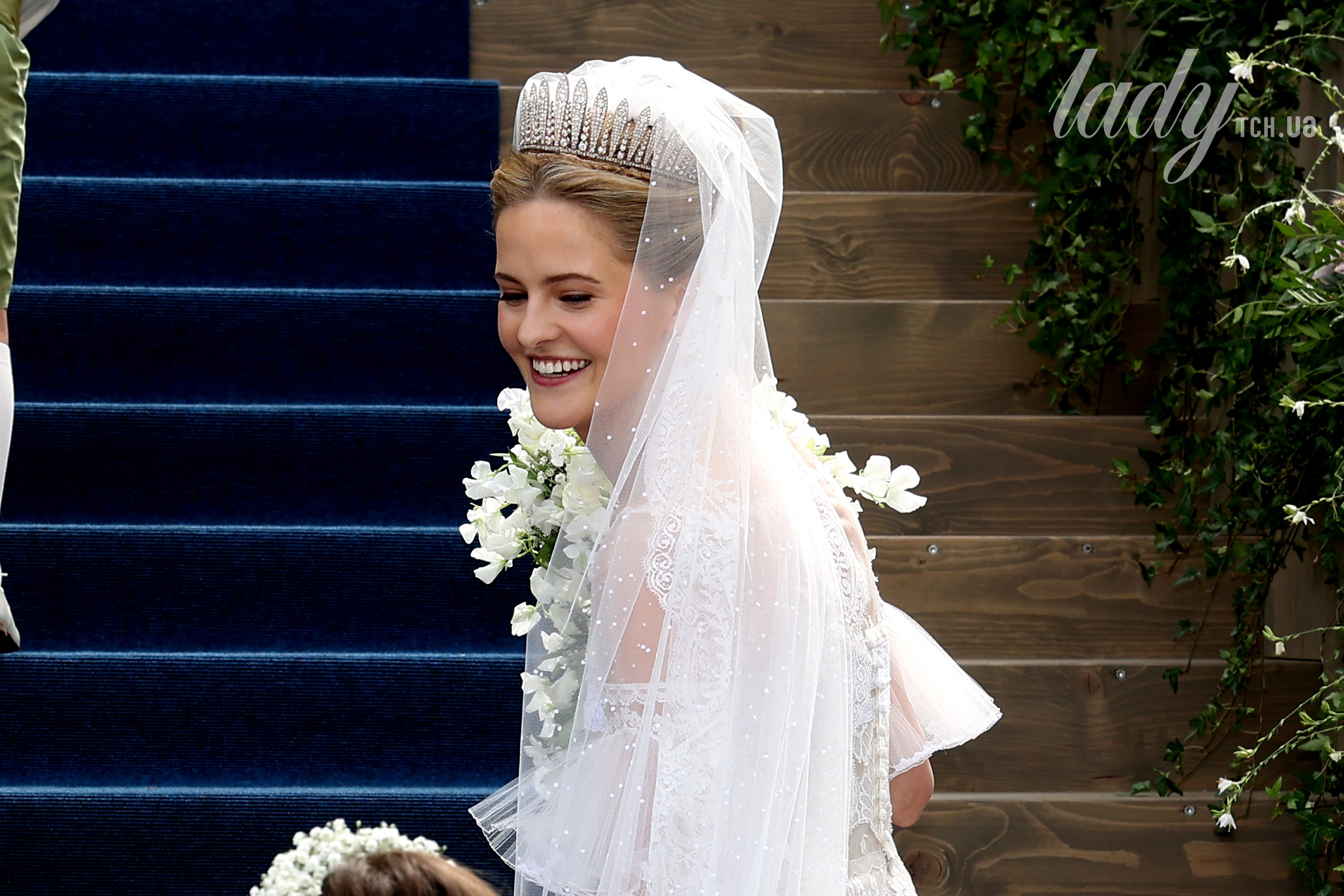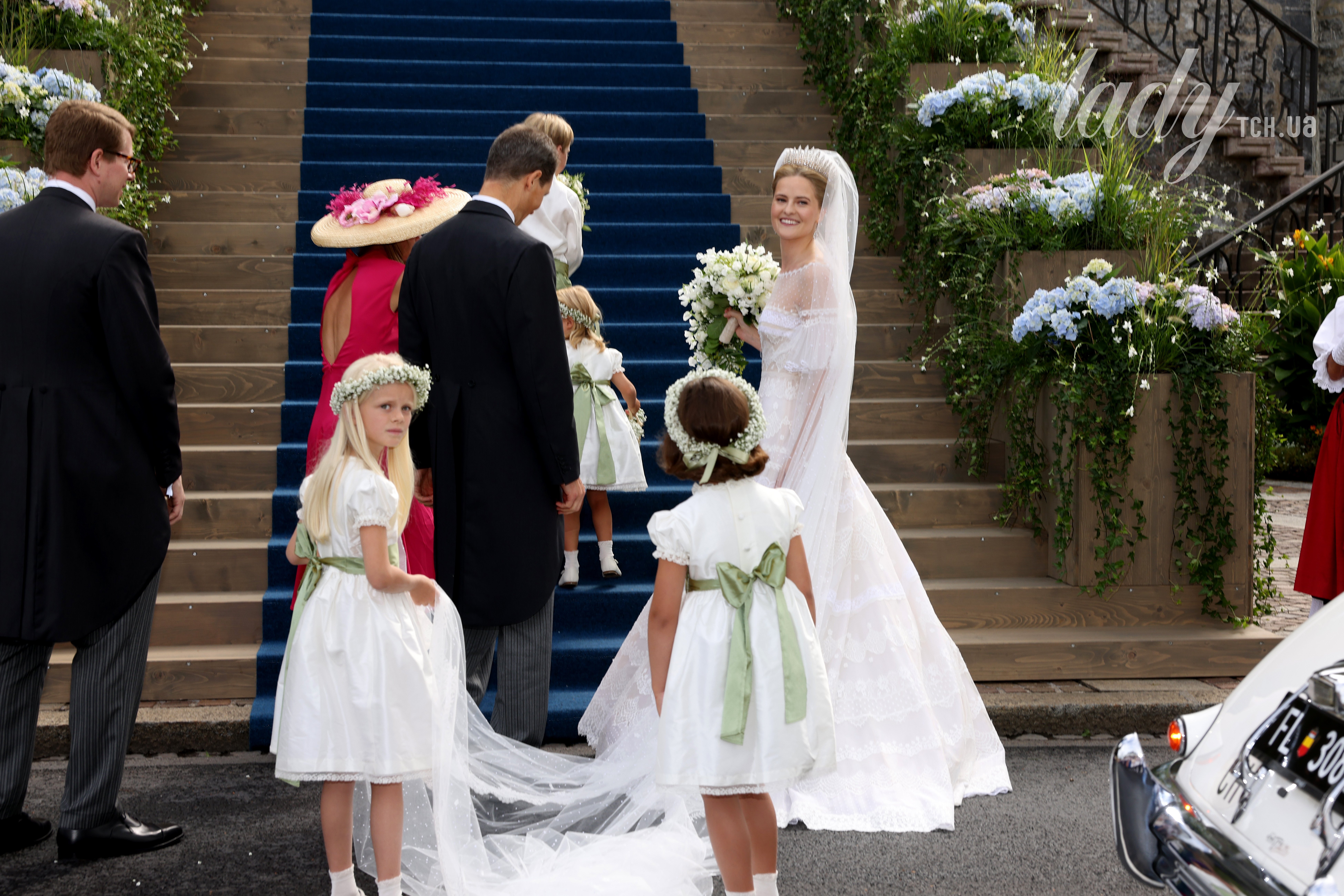 Голову принцеси Ліхтенштейну прикрашала довга фата з вишивкою, яка ефектно розвівалася, а її довгий шлейф перехоплював подих. Також дівчина несла в руках пишний букет з білих квітів.