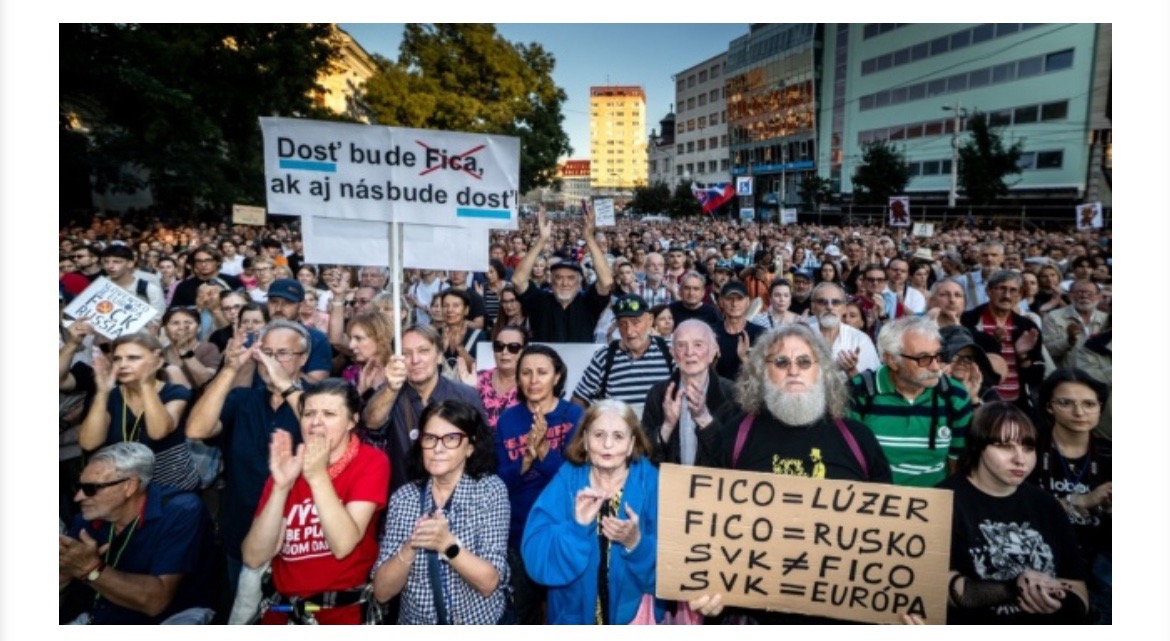 Натовп, що зібрався на центральній площі Братислави, скандував: «Ганьба, ганьба…. Досить нам Фіцо». Зазначається, що остання хвиля протестів була спричинена візитом Фіцо до Китаю, де він втретє після повномасштабного вторгнення Росії в Україну зустрівся з Путіним.