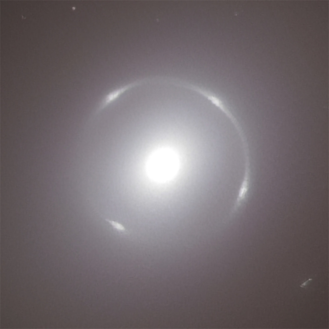 Кільце навколо галактики на передньому плані складається зі світла від дальньої яскравої галактики, що знаходиться на відстані у 4,42 мільярда світлових років від Землі, і її світло було спотворено гравітацією на шляху до нашої планети. Ця віддалена галактика раніше не спостерігалася і поки що не має назви.