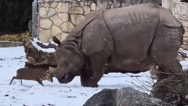У зоопарку польського міста Вроцлав відбулася епічна битва карликового оленя та носорога.
