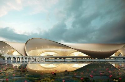 Аеропорт, розроблений Zaha Hadid Architects, натхненний формою лотоса , що символізує чистоту та сталий розвиток. Інтер'єр поєднує традиційні індійські розписи з сучасними матеріалами та світлом, а дах прикрашений золотими пелюстками.