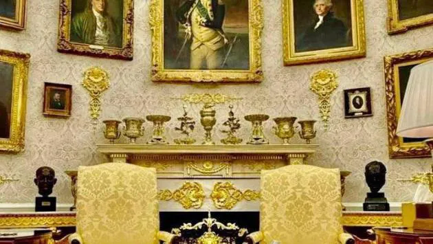 Ще навесні Трамп пояснив журналістці Fox News Лорі Інгрем, що залу «треба було більше життя». З того часу інтер’єр кабінету помітно змінився: стеля заввишки 5,6 метра отримала позолочені елементи, з’явилися нові штори та декоративні фрагменти, включаючи навіть позолочених янголят над дверними отворами.