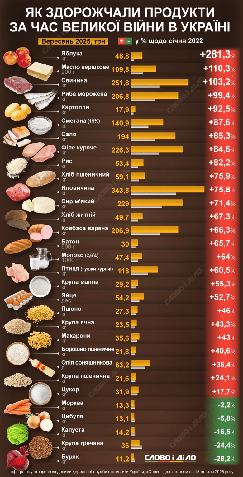 Найвідчутніше для гаманців українців зросла вартість яблук — аж на 281,3%, приблизно від 12,8 грн до 48,8 грн за кілограм. Майже вдвічі, на 110,3%, підскочила ціна на пачку вершкового масла. Тепер близько 110 грн за 200 грамів.