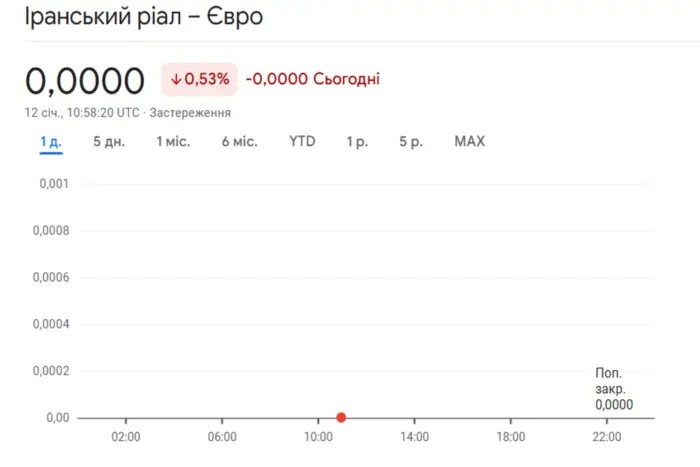 Іранський ріал фактично знецінився до нульових значень на тлі масових протестів та політичної нестабільності в країні. Про це повідомляє сервіс Google.