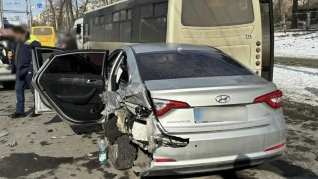 Нетверезий водій в Києві влаштував потрійну аварію на дорозі. Він зіткнувся з маршруткою і автопідйомником, є постраждала.