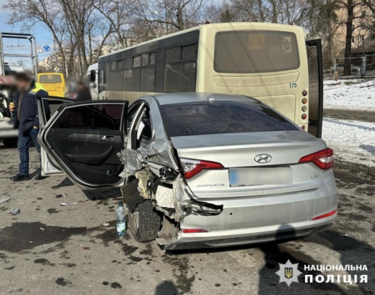 Нетверезий водій в Києві влаштував потрійну аварію на дорозі. Він зіткнувся з маршруткою і автопідйомником, є постраждала.