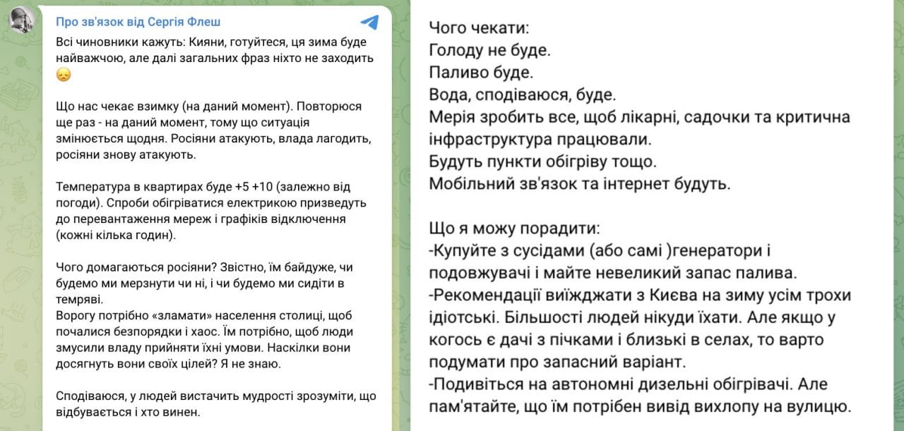 «Рекомендації виїжджати з Києва на зиму усім трохи ідіотські. Більшості людей нікуди їхати. Але якщо у когось є дачі з пічками і близькі в селах, то варто подумати про запасний варіант… Звичайно, ми вистоїмо, але буде важко», — підсумував Сергій Бескрестнов.