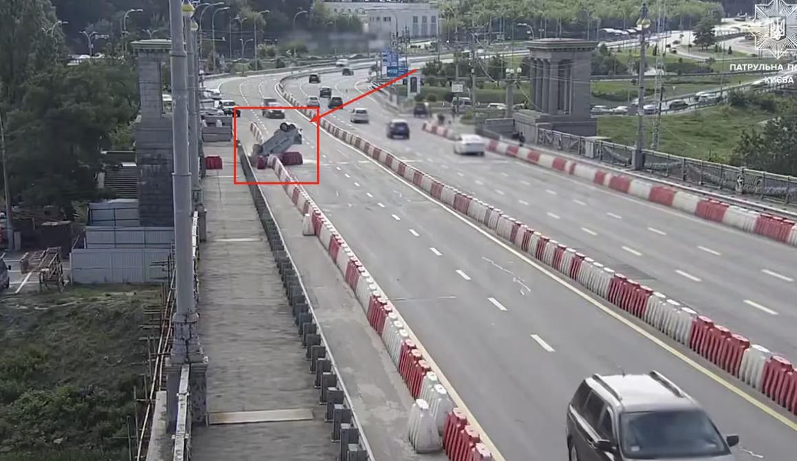У Києві на мосту Патона легковик на швидкості наїхав на обмежувач та перекинувся на дах.