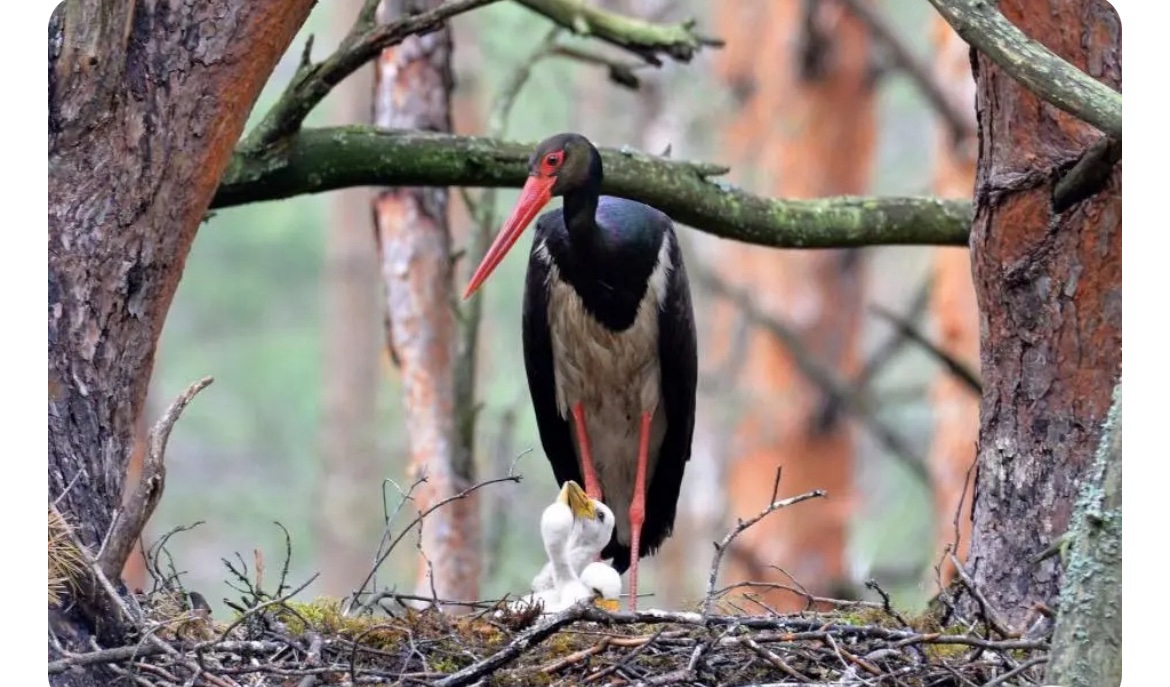 Чорних лелек орнітологи назвали новим відкриттям для Чорнобильського біосферного заповідника. Дослідникам вдалося зафіксувати гніздо цього рідкісного птаха — на фото видно і пташенят, повідомляє bigkyiv.com.ua.