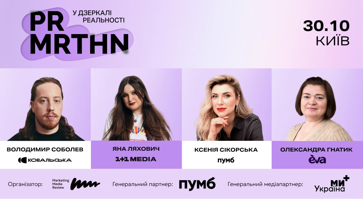 30 жовтня 2025 року понад 300 комунікаційників і маркетологів та 30 спікерів з усієї України візьмуть участь у PR-марафоні «У дзеркалі реальності». У програмі: 4 панельні дискусії, кейси від ПУМБ, «Ковальська», Eva, Bolt, корпорації «Біосфера» та інших топових компаній, церемонія нагородження Конкурсу PR-кейсів.