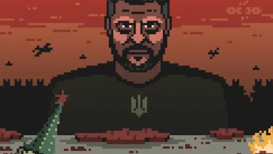 На зображенні, яке опублікував Telegram-канал “Вітер степовий”, можна побачити президента Зеленського посеред московського Кремля. Одна з веж споруди лежить на землі, оповита вогнем. Стіни Кремля мають численні пошкодження.