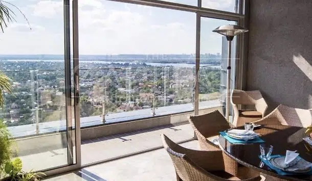 В оголошенні про продаж, зазначається, що унікальність квартири – це огляд на 280 градусів, зокрема на Дніпро, завдяки широким панорамним вікнам і кільком терасам.
