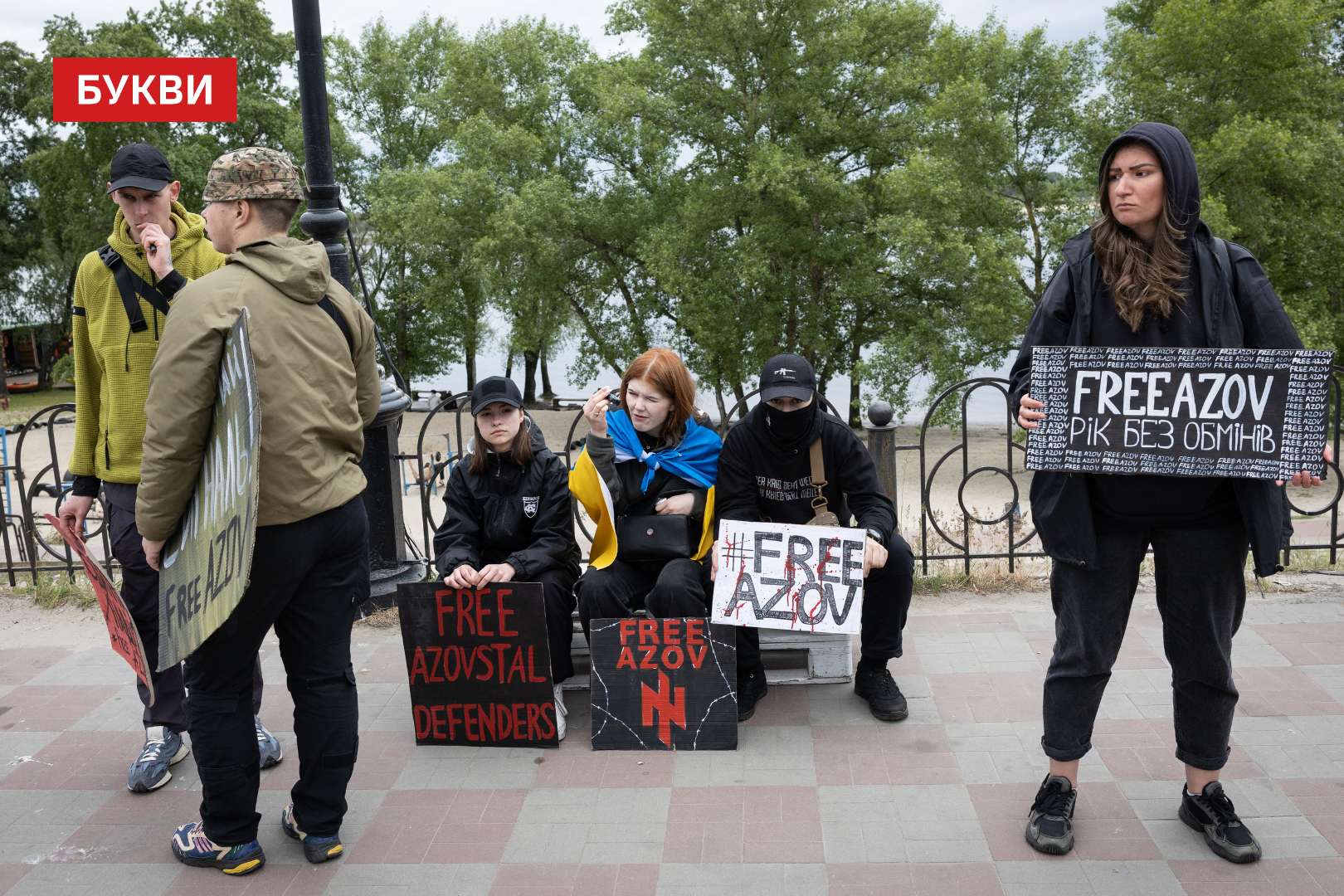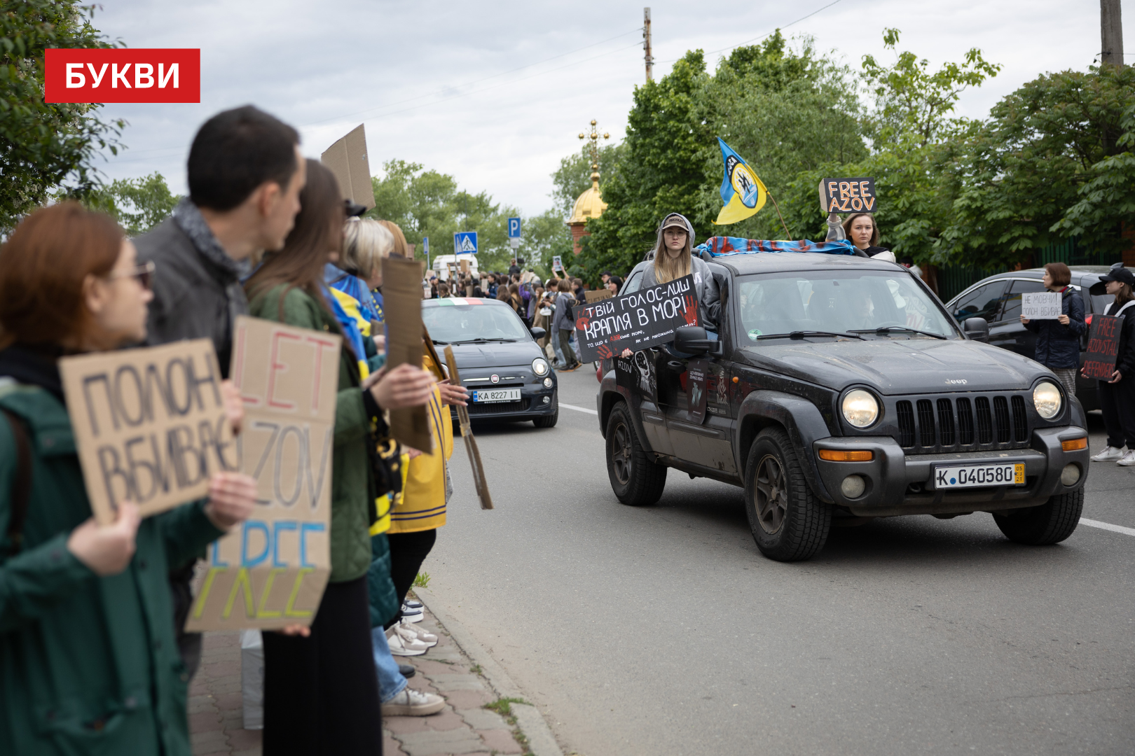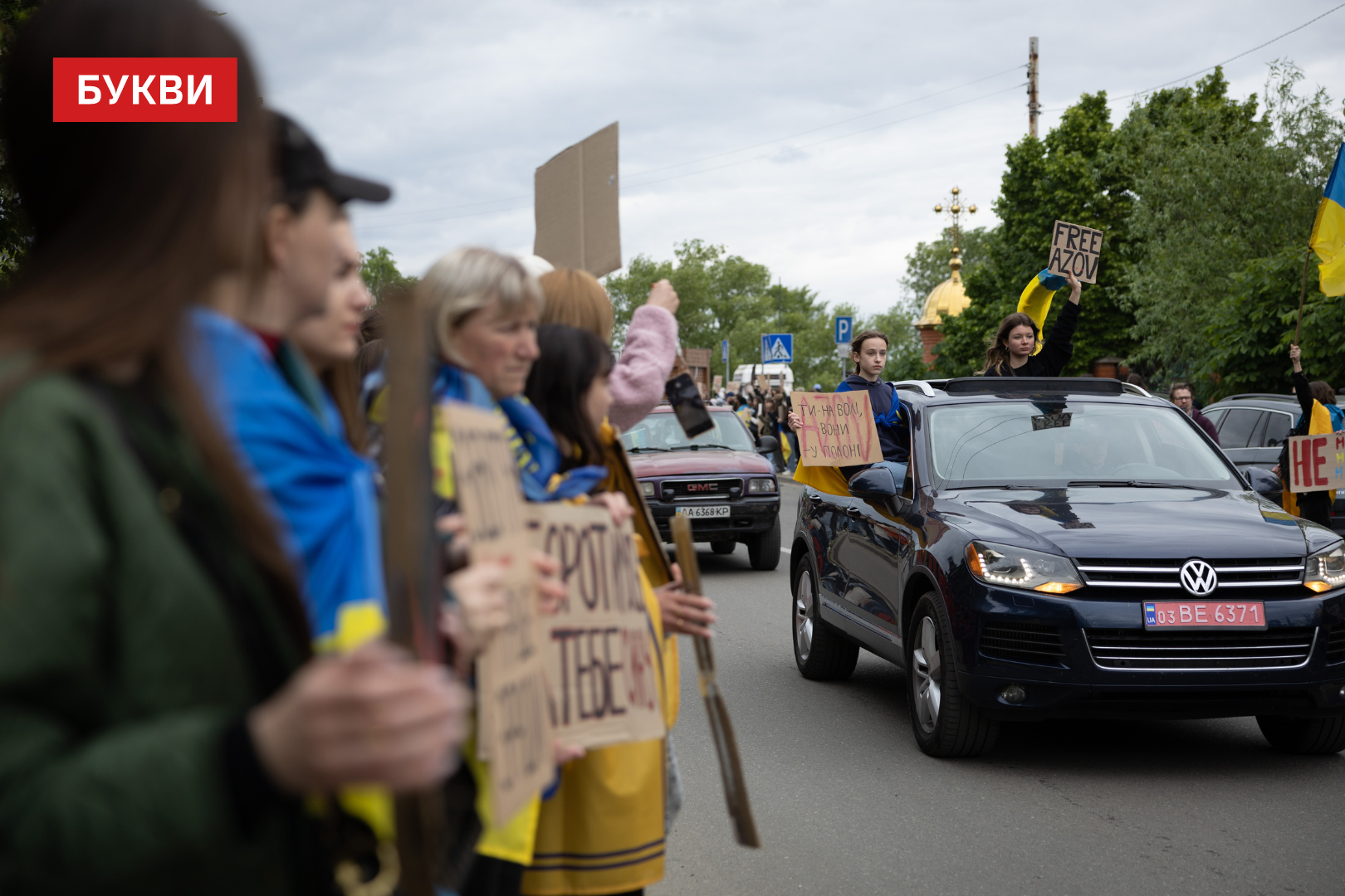 Сотні мітингувальників стояли обабіч дороги, з плакатами “Третя весна у полоні”, “FreeAzov”, “Їх дуже чекають вдома”, “Не мовчи”, “Полон – це пекло”, “Твоя байдужість їх вбиває”.