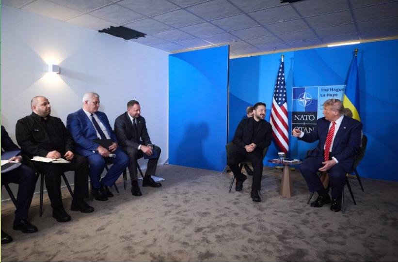 ЗМІ опублікували перше фото зустрічі президента України Володимира Зеленського з президентом США Дональдом Трампом на полях саміту НАТО в Гаазі.