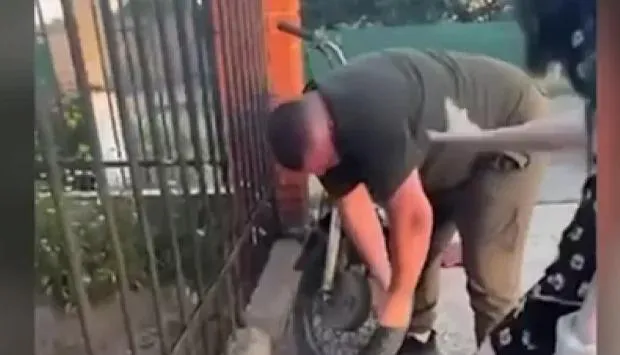 У соцмережі потрапило відео, на якому чоловік у військовій формі ножем пробиває колеса мотоциклам. При цьому перехожі намагаються зупинити його, але військовий ніяк не реагує і продовжує псувати майно.