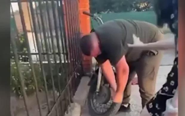 У соцмережі потрапило відео, на якому чоловік у військовій формі ножем пробиває колеса мотоциклам. При цьому перехожі намагаються зупинити його, але військовий ніяк не реагує і продовжує псувати майно.