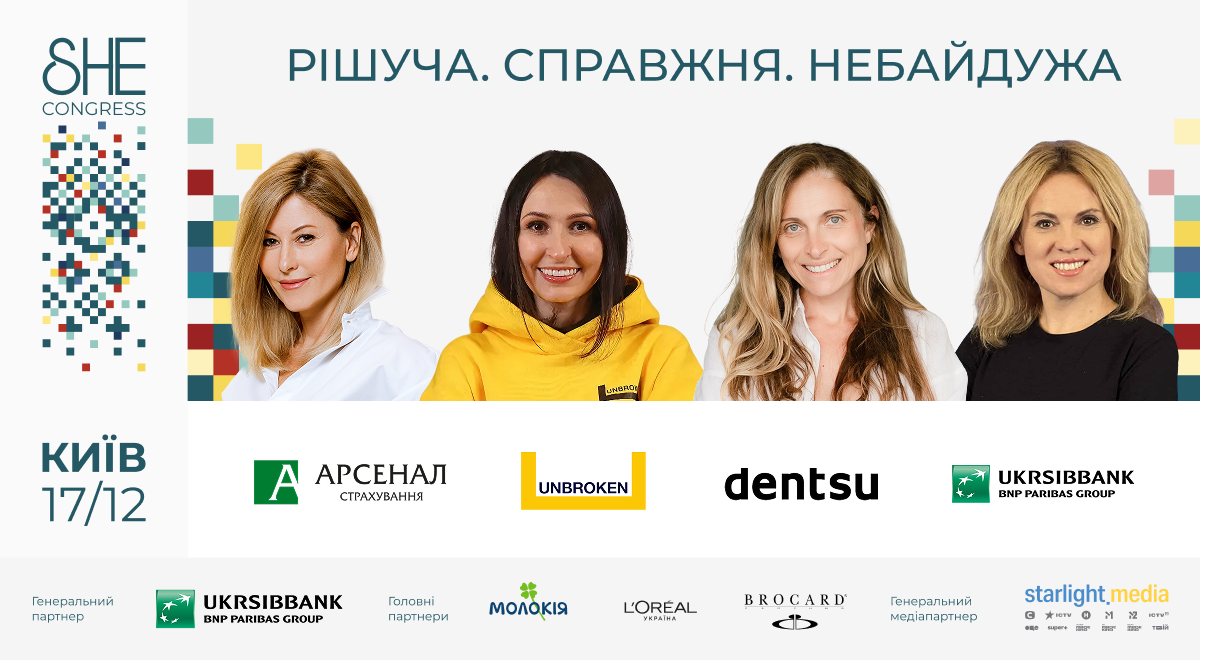 She in Business. Чесний досвід сучасних керівниць про виклики, загартування та нові ролі у бізнесі. Серед спікерів Юлія Завалішина (Київстар), Марина Авдєєва («Арсенал Страхування», Easy Peasy Insurtech), Інна Тютюн (Sense Bank) та інші.
