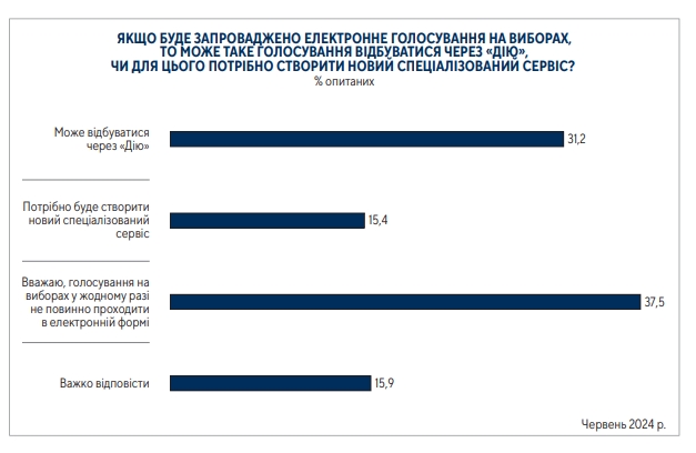 Майже третина (31%) опитаних при запровадженні електронного голосування на виборах вважають, що воно може відбуватися через “Дію”, 15% ˗ що потрібно буде створити новий спеціалізований сервіс. Водночас 37,5% відповіли, що голосування на виборах у жодному разі не повинно проходити в електронній формі, інші (16%) вагалися з відповіддю.
