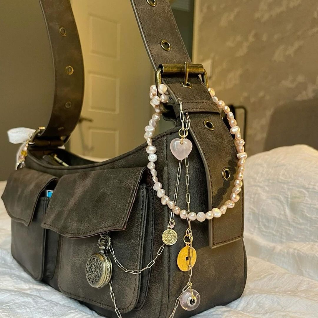 Восени 2025 року намиста на сумках залишаються. Це можуть бути підвіски з великих намистин або намиста. Вони надають сумці індивідуальності. Ефектно виглядають нитки з яскравими намистинами – наприклад, у кораловому відтінку. Таку нитку можна доповнити великим ланцюгом у золотому відтінку або великою квіткою-брошкою. Також важливо продумати поєднання відтінків кольорів.