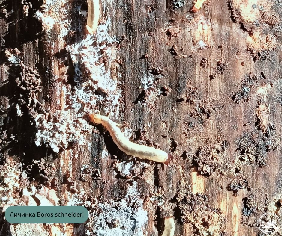 Личинки Борос Шнайдера легше помітити. Вони розвиваються під корою відмерлих сосен або інших дерев, за умови достатньої вологості деревини. Личинки мають напівпрозоре світло-коричневе тіло з темною смугою травної системи, коричневою головою та характерною “вилочкою” на останньому сегменті черевця. Вони заселяють ослаблені або мертві дерева, не завдаючи шкоди здоровим лісам.