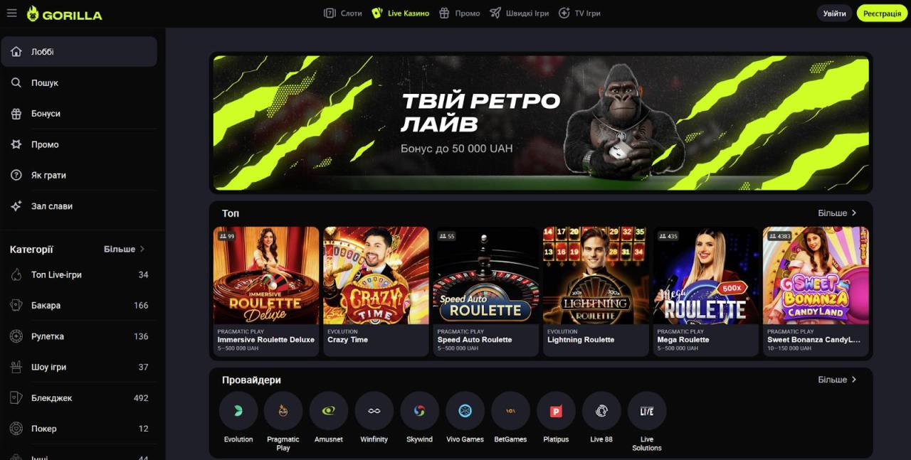 Також зверніть увагу на банери. Наприклад, акція “Твій Ретро Лайв” з бонусом до 50 000 UAH. Казино Горила часто проводить тематичні івенти саме для лайв-сегменту, тому не забувайте заглядати в розділ “Бонуси”.