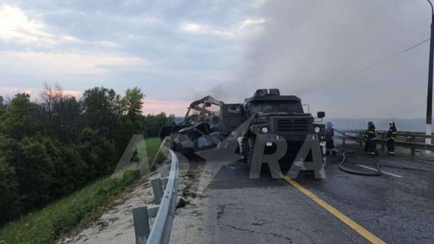 За словами очевидців, інцидент стався на трасі М-4 під Єльцем внаслідок ДТП. Вантажівка “Озона” зіткнулася з колоною військових. У вогні згоріли автомобілі “Ахмат”, п’ять “УАЗів” та фура — лише сім одиниць техніки. Постраждала одна людина.