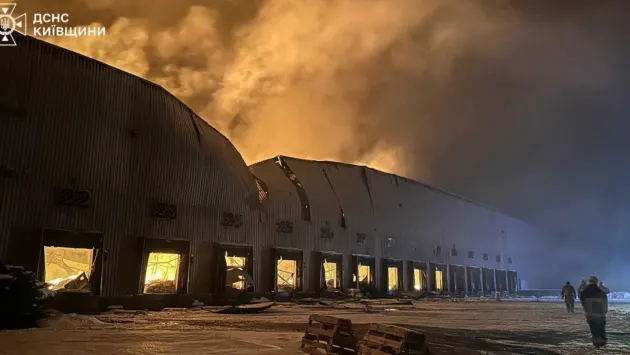 У ДСНС також повідомили, що внаслідок нічної російської атаки безпілотниками в місті Яготин Бориспільського району виникла пожежа на території складського комплексу.