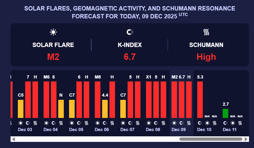 У вівторок, 9 грудня, магнітна буря значно посилилася. Збурення сягнуло червоного рівня та буде відповідати К-індексу 6.7.
