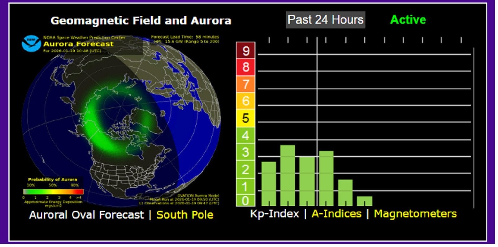 К-індекс геомагнітної активності досяг значення 5 о 16:26 UTC 16 січня, що відповідає малій бурі за шкалою NOAA. У зв’язку з цим у високих широтах можливі спостереження полярного сяйва, зокрема у вихідні дні.